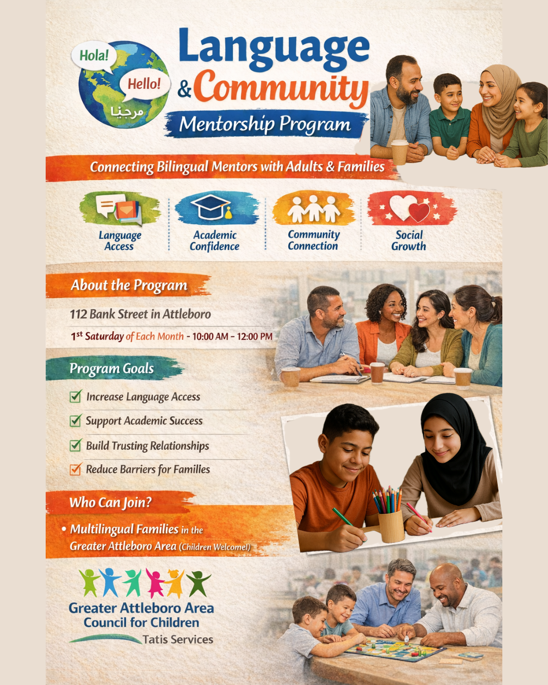 Our new Language & Community Mentorship Program will meet on the first Saturday of each month. This program connects multilingual families with bilingual mentors to build language access, confidence, and community—children are welcome. Join us at 112 Bank Street in Attleboro, 10:00 AM–12:00 PM on February 7th. RSVP to info@councilforchildren.org